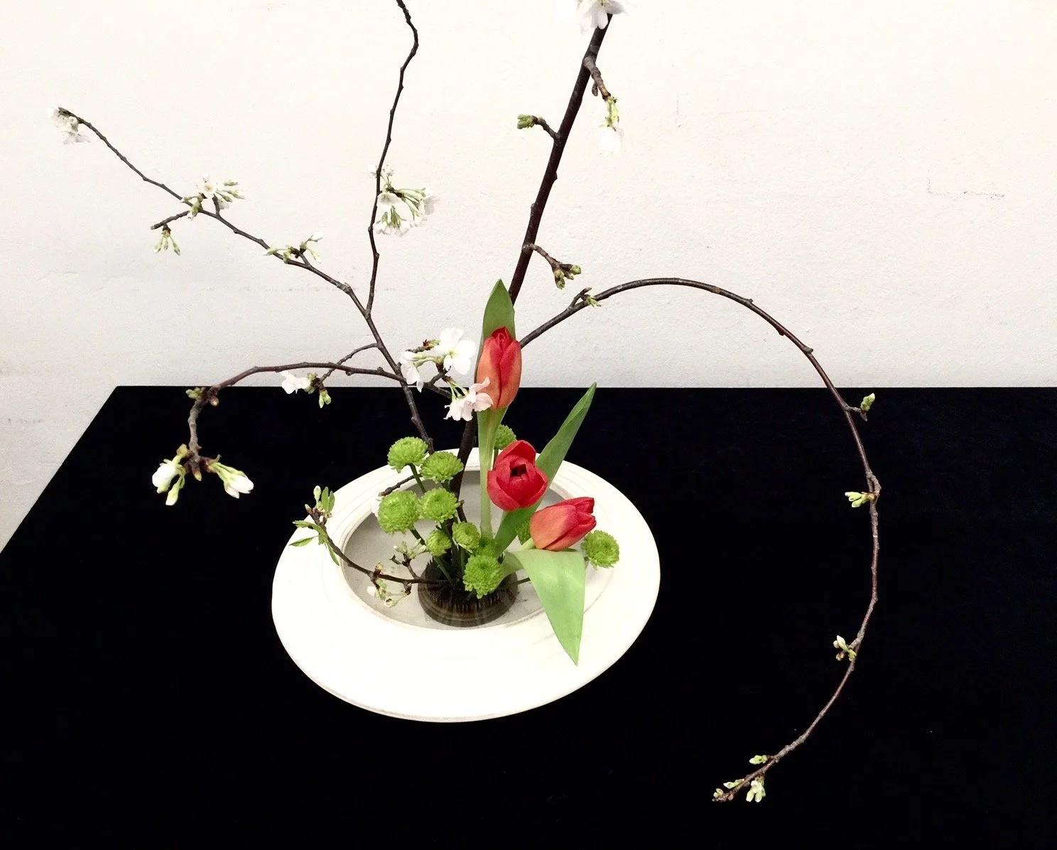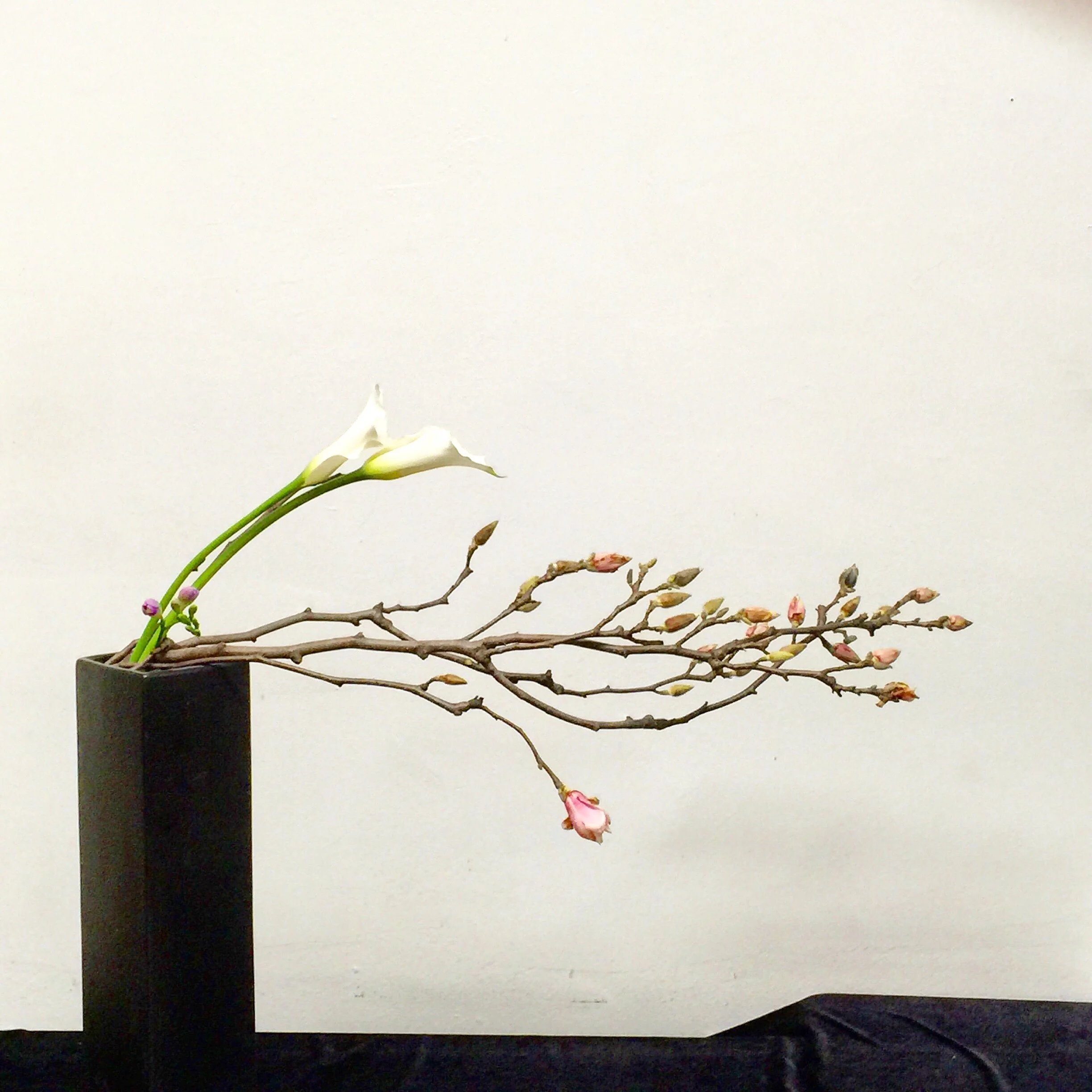 Translating to “Flung Flowers,” Nagiere style is private, minimalistic, and informal in character. Flower seems almost “thrown” into the container with a studied casualness, so that the stem is anchored into the container and highlights vertical lines. Using a tall vase with a narrow opening, branches are arranged to give an airy feeling and create a curved line in the air.
